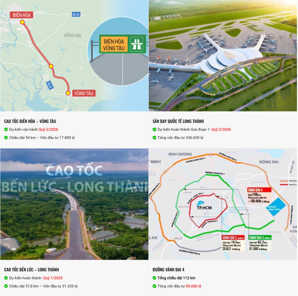 Sân bay Quốc tế Long Thành cũng sẽ thúc đẩy sự phát triển hạ tầng khu vực, đặc biệt là các tuyến giao thông lớn kết nối đến sân bay như cao tốc TP Hồ Chí Minh – Long Thành – Dầu Giây mở rộng, cao tốc Biên Hòa – Vũng Tàu, cao tốc Bến Lức – Long Thành, cùng với các tuyến đường sắt và đường Vành đai. Những cơ sở hạ tầng này sẽ gián tiếp thúc đẩy lưu thông hàng hóa, sản xuất và thương mại, từ đó kích thích nền kinh tế liên vùng, trong đó bất động sản cũng sẽ được hưởng lợi.
