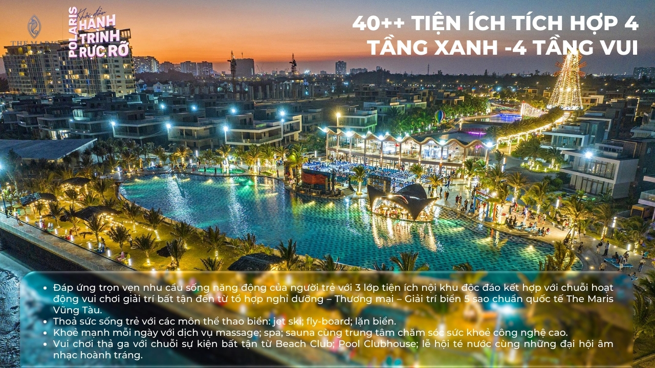 - Đáp ứng trọn vẹn nhu cầu sống năng động của người trẻ với 3 lớp tiện ích nội khu độc đáo kết hợp với chuỗi hoạt động vui chơi giải trí bất tận đến từ tổ hợp nghỉ dưỡng – Thương mại – Giải trí biển 5 sao chuẩn quốc tế The Maris Vũng Tàu.