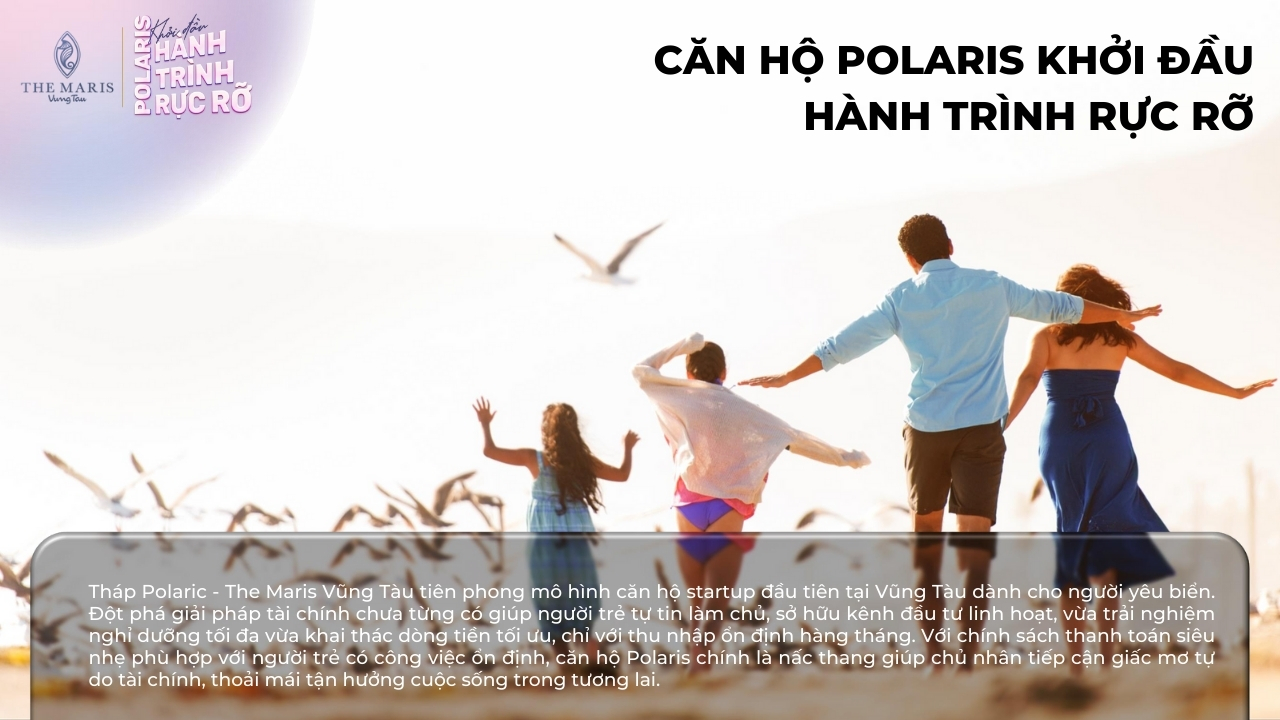 Tháp Polaric – The Maris Vũng Tàu tiên phong mô hình căn hộ startup đầu tiên tại Vũng Tàu dành cho người yêu biển. Đột phá giải pháp tài chính chưa từng có giúp người trẻ tự tin làm chủ, sở hữu kênh đầu tư linh hoạt, vừa trải nghiệm nghỉ dưỡng tối đa vừa khai thác dòng tiền tối ưu, chỉ với thu nhập ổn định hàng tháng. Với chính sách thanh toán siêu nhẹ phù hợp với người trẻ có công việc ổn định, căn hộ Polaris chính là nấc thang giúp chủ nhân tiếp cận giấc mơ tự do tài chính, thoải mái tận hưởng cuộc sống trong tương lai.