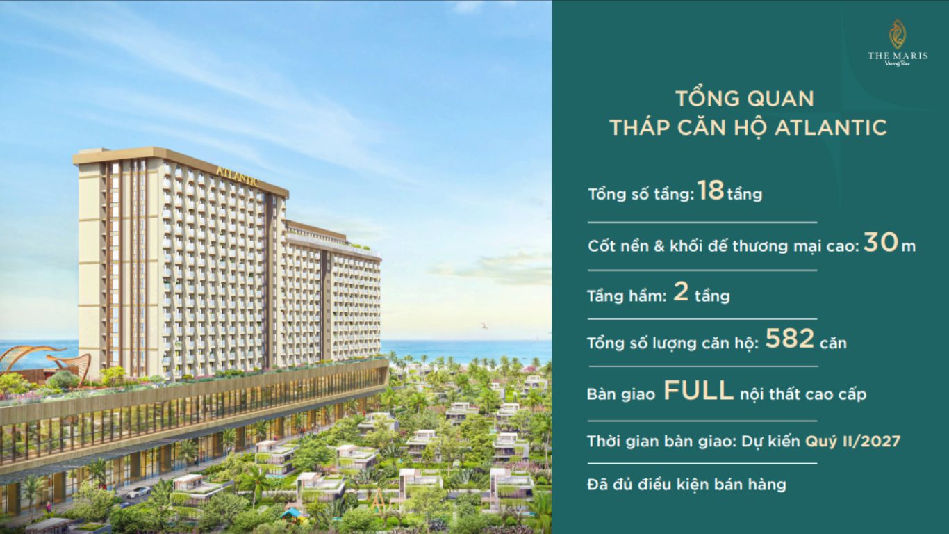 Atlantic Vũng Tàu là tòa căn hộ cao cấp thuộc quần thể nghỉ dưỡng 5 sao The Maris Vũng Tàu, khu phức hợp nghỉ dưỡng, thương mại và giải trí quy mô lớn tại thành phố biển. Sở hữu vị trí gần biển nhất dự án, Atlantic mang đến trải nghiệm sống cân bằng giữa thiên nhiên và tiện nghi hiện đại, với tầm nhìn hướng biển rộng mở.