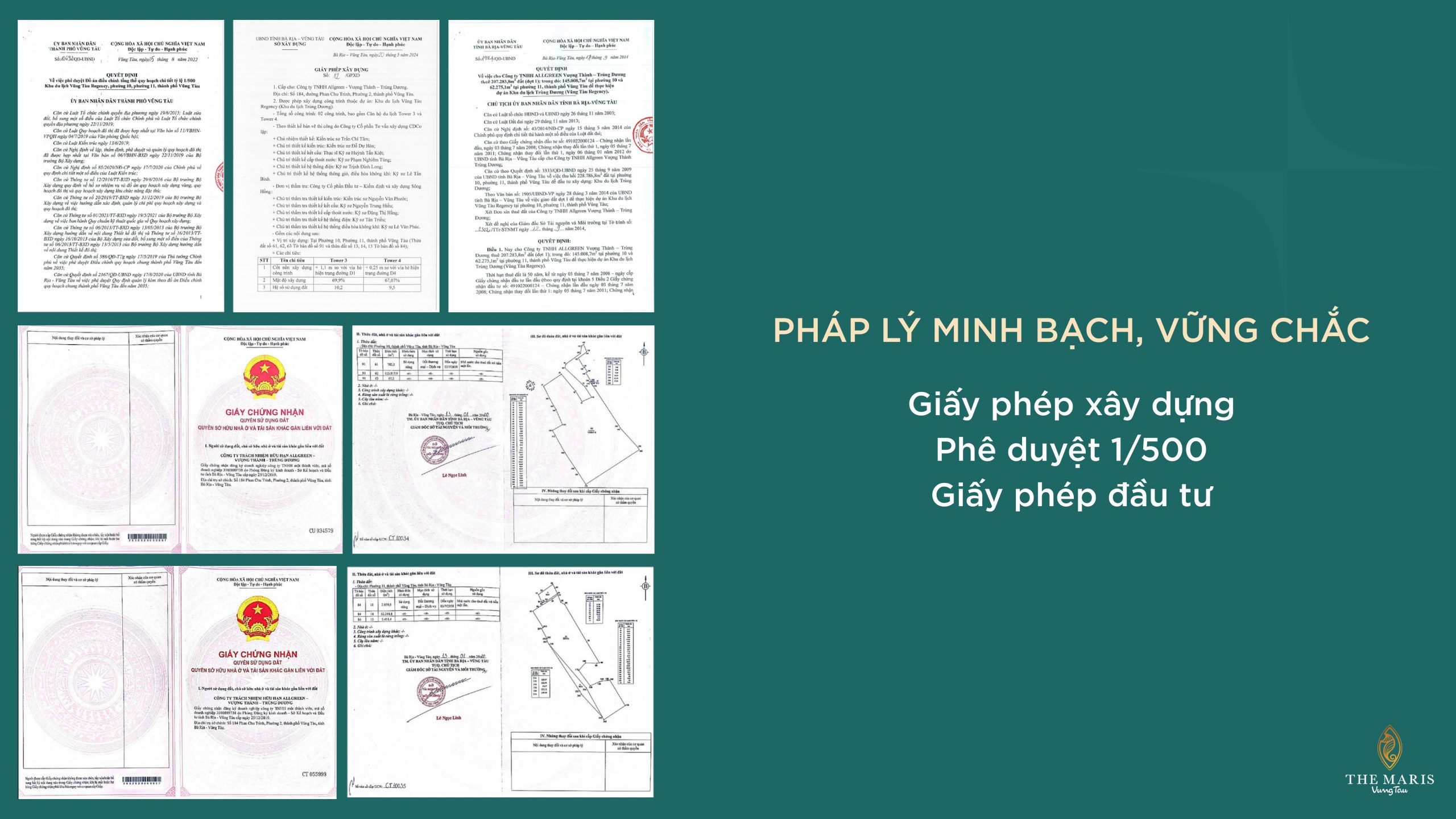 - Pháp lý: Giấy phép đầu tư, quy hoạch 1/500, giấy phép xây dựng