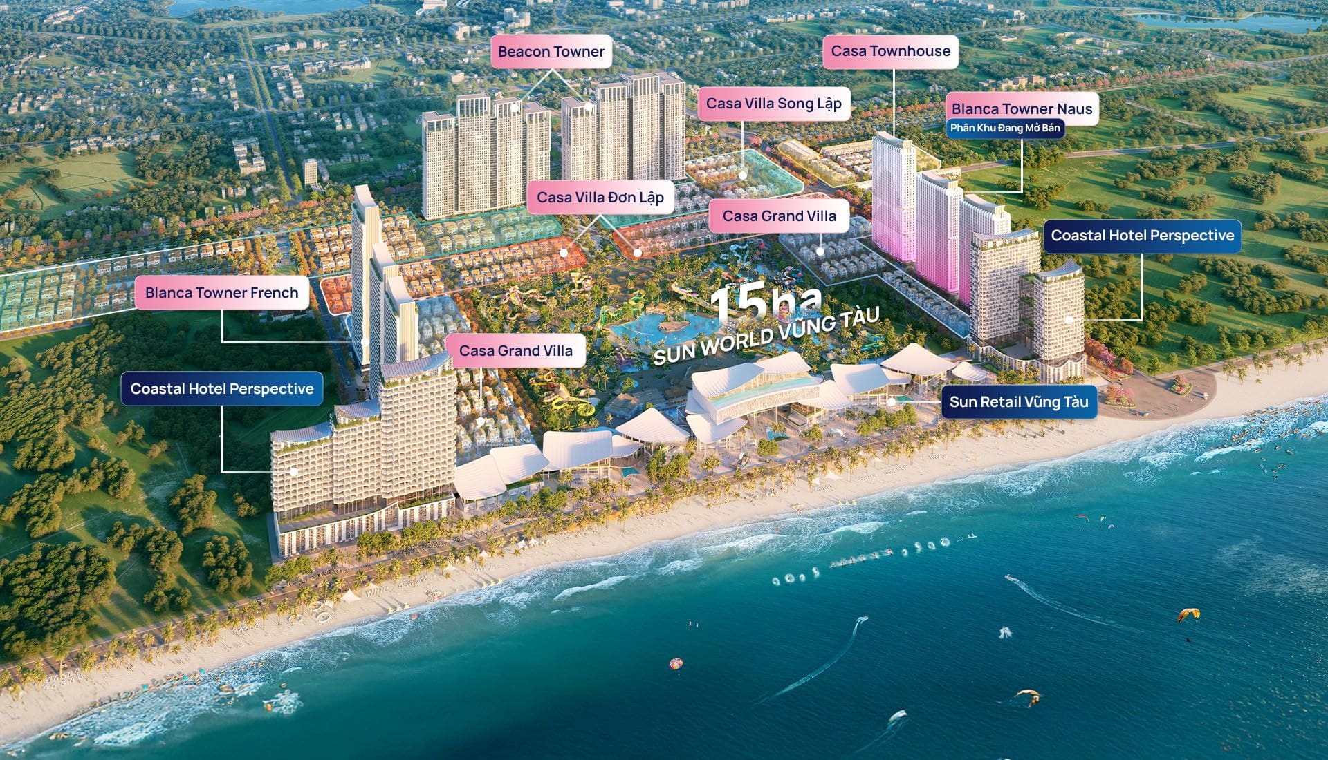 Dự án tích hợp đầy đủ: Công viên nước Sun World, trung tâm thương mại Sun Retail, khách sạn 5 sao, trường học, y tế, chuỗi công viên chủ đề… tạo nên không gian sống khép kín – tiện nghi – hiện đại.