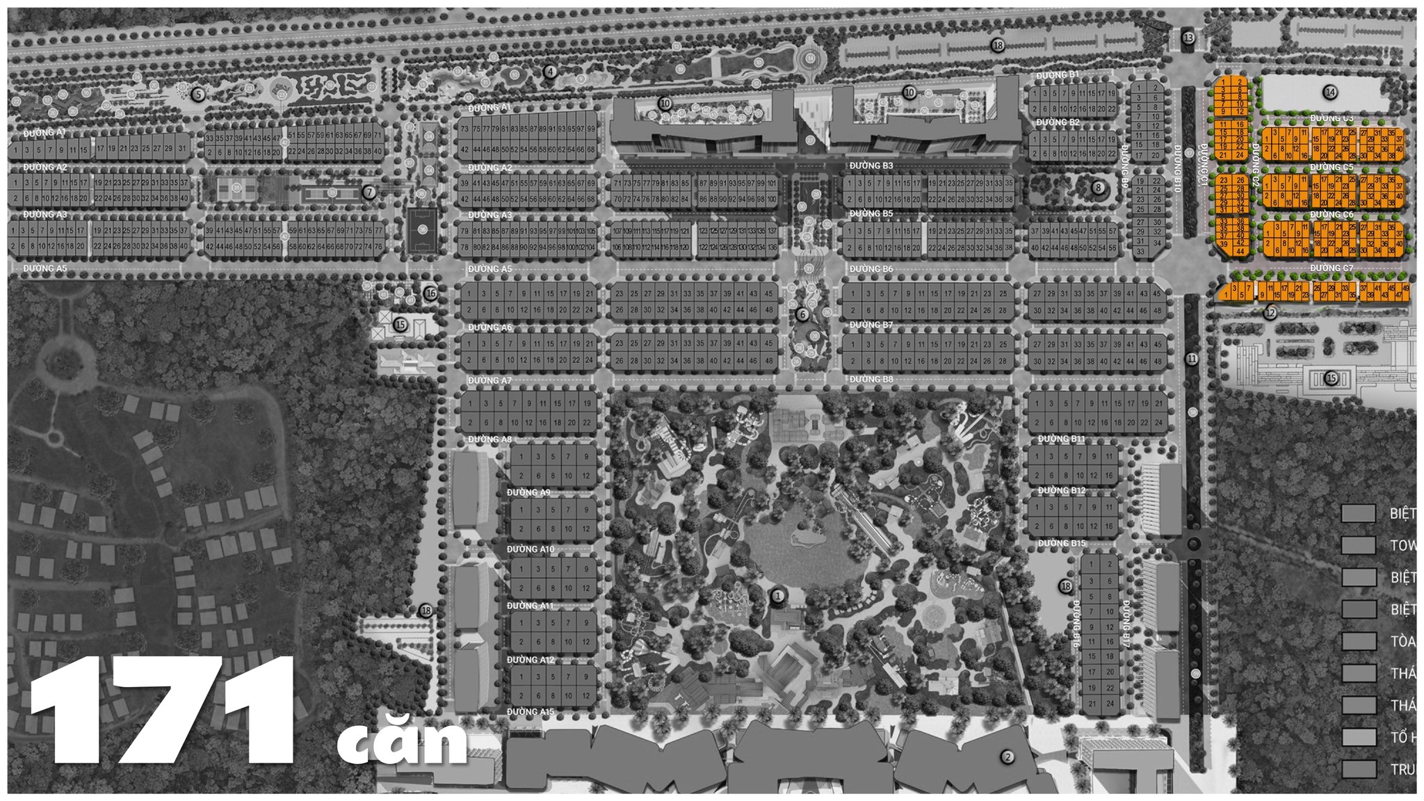 - Phần còn lại được bố trí hợp lý cho hệ thống giao thông, cây xanh và tiện ích cộng đồng