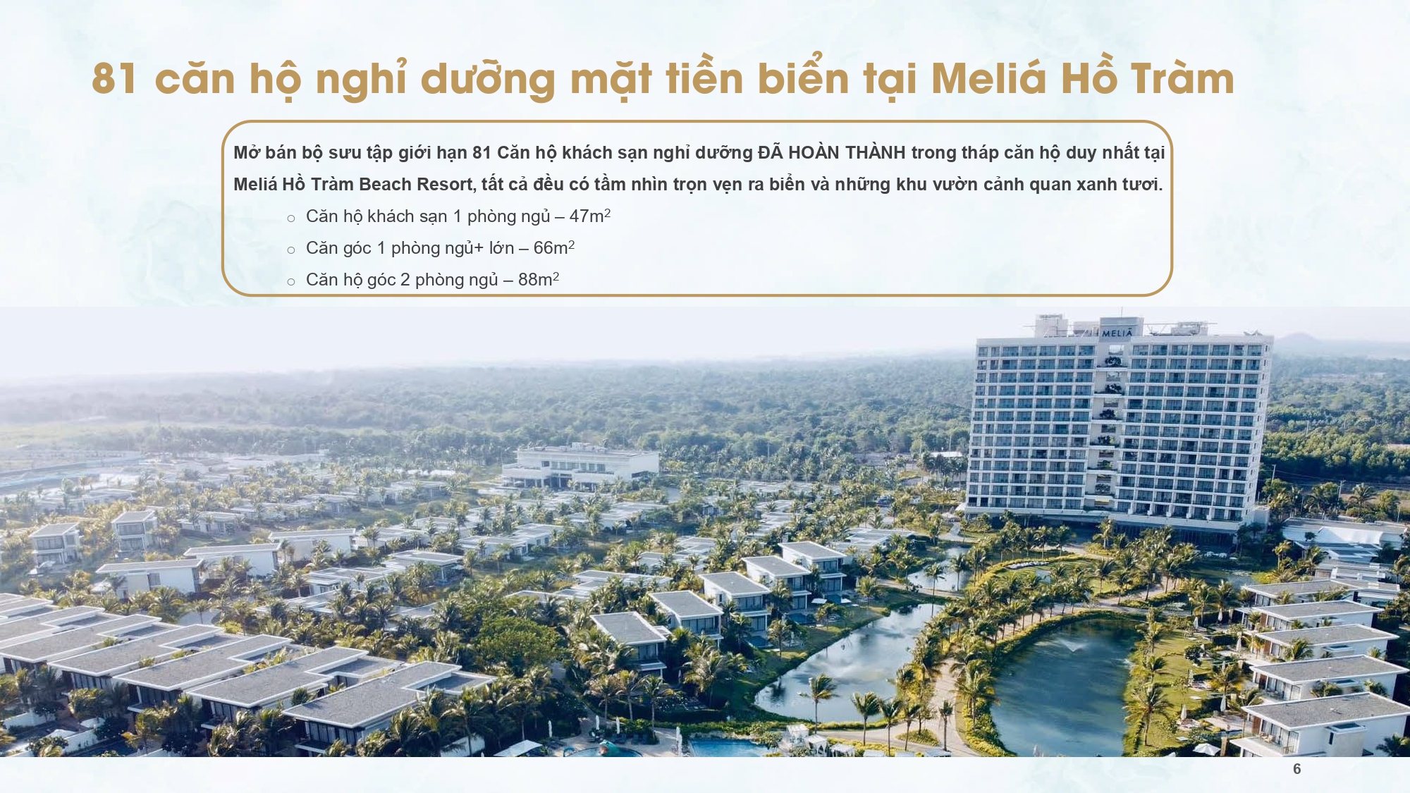 Mở bán bộ sưu tập giới hạn 81 Căn hộ khách sạn nghỉ dưỡng ĐÃ HOÀN THÀNH trong tháp căn hộ duy nhất tại Meliá Hồ Tràm Beach Resort, tất cả đều có tầm nhìn trọn vẹn ra biển và những khu vườn cảnh quan xanh tươi.