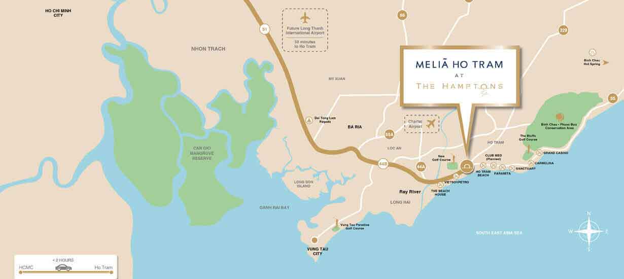 Melia Hồ Tràm nằm trên địa phận xã Phước Thuận, huyện Xuyên Mộc, tỉnh Bà Rịa – Vũng Tàu. Dự án chỉ cách TP. Vũng Tàu 40km, sân bay quốc tế Long Thành 45km và cách Tp.HCM 90 phút lái xe theo đường cao tốc Tp.HCM – Long Thành – Dầu Giây.