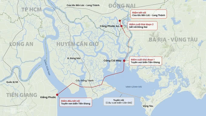 Đặc biệt, một phương án quan trọng đang được xem xét là kết nối TP.Hồ Chí Minh với Bà Rịa-Vũng Tàu thông qua cầu vượt biển Cần Giờ. Phương án này không chỉ rút ngắn khoảng cách giữa hai tỉnh mà còn tạo động lực phát triển mạnh mẽ cho Bà Rịa-Vũng Tàu, thúc đẩy kinh tế biển, du lịch và cảng biển.