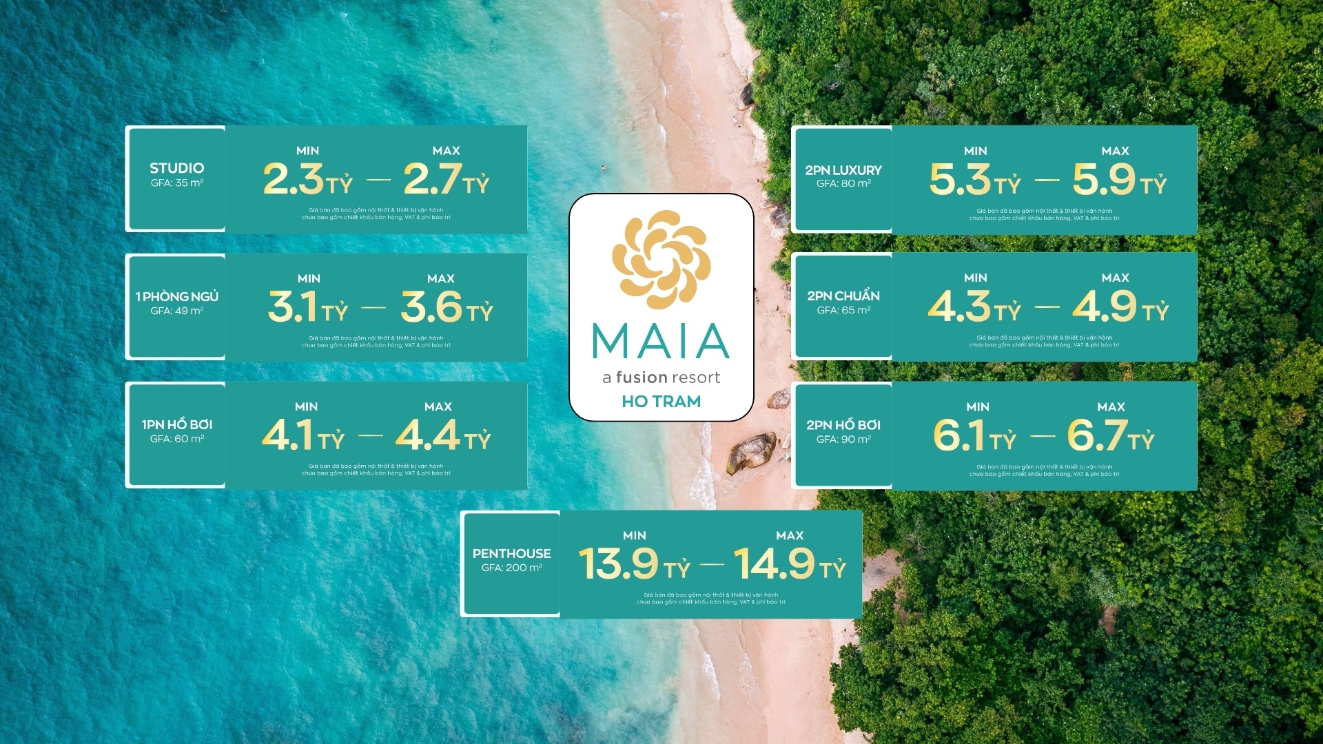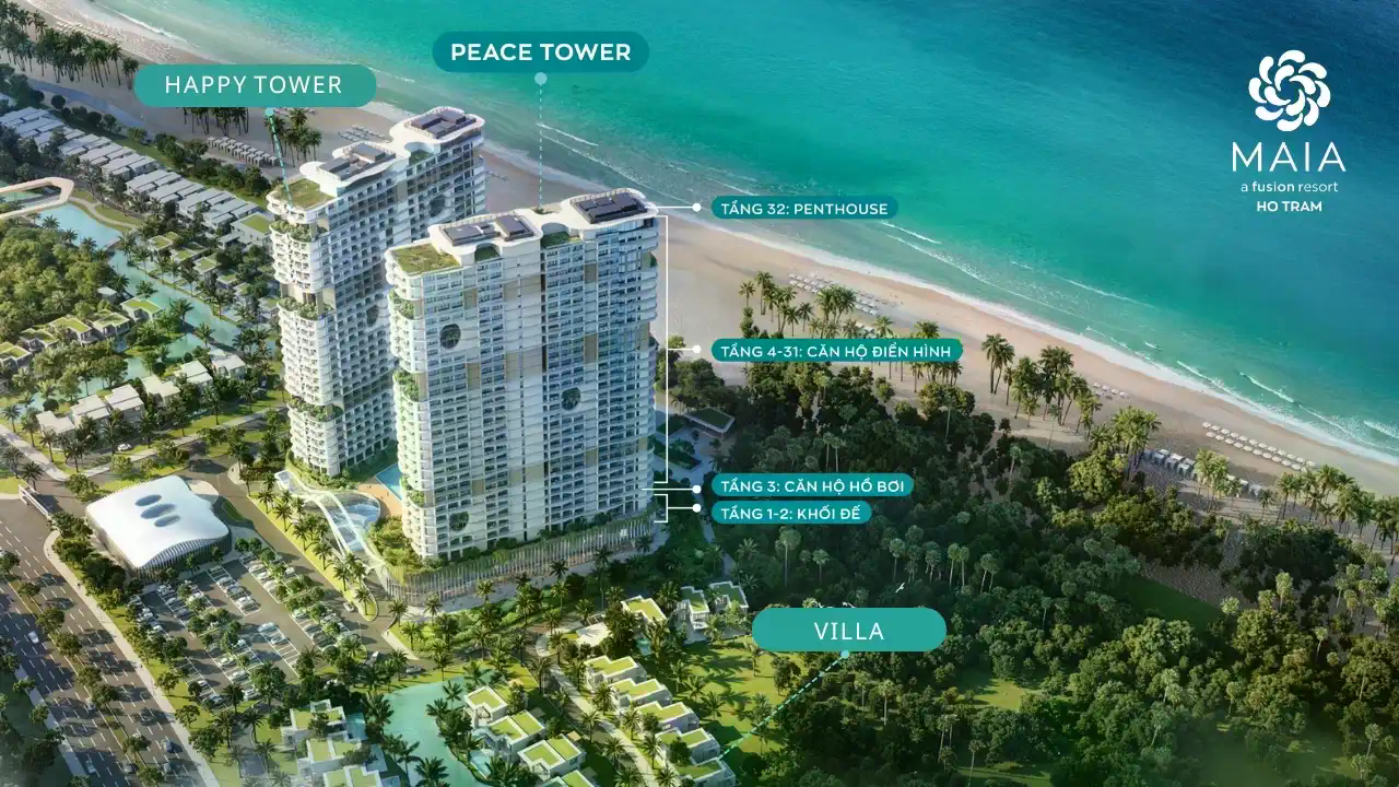 Maia Resort Hồ Tràm có quy mô 7 ha, gồm hai tòa căn hộ cao 21 tầng với 1.244 sản phẩm và 36 biệt thự biển giới hạn. Mỗi căn hộ và biệt thự đều sở hữu tầm nhìn biển, thiết kế hiện đại, nội thất cao cấp và vận hành theo tiêu chuẩn quốc tế, phù hợp nghỉ dưỡng và khai thác cho thuê.