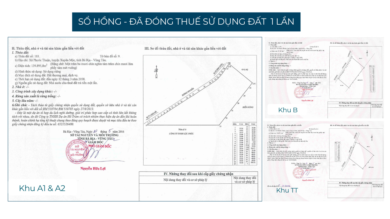 Maia Resort Hồ Tràm sở hữu pháp lý rõ ràng và minh bạch. Dự án được quy hoạch bài bản trên quỹ đất thương mại dịch vụ, đã có giấy phép xây dựng đầy đủ và hoàn tất nghĩa vụ tài chính với Nhà nước. Đây cũng là tiêu chuẩn chung trong toàn bộ tổ hợp nghỉ dưỡng The Grand Hồ Tràm.