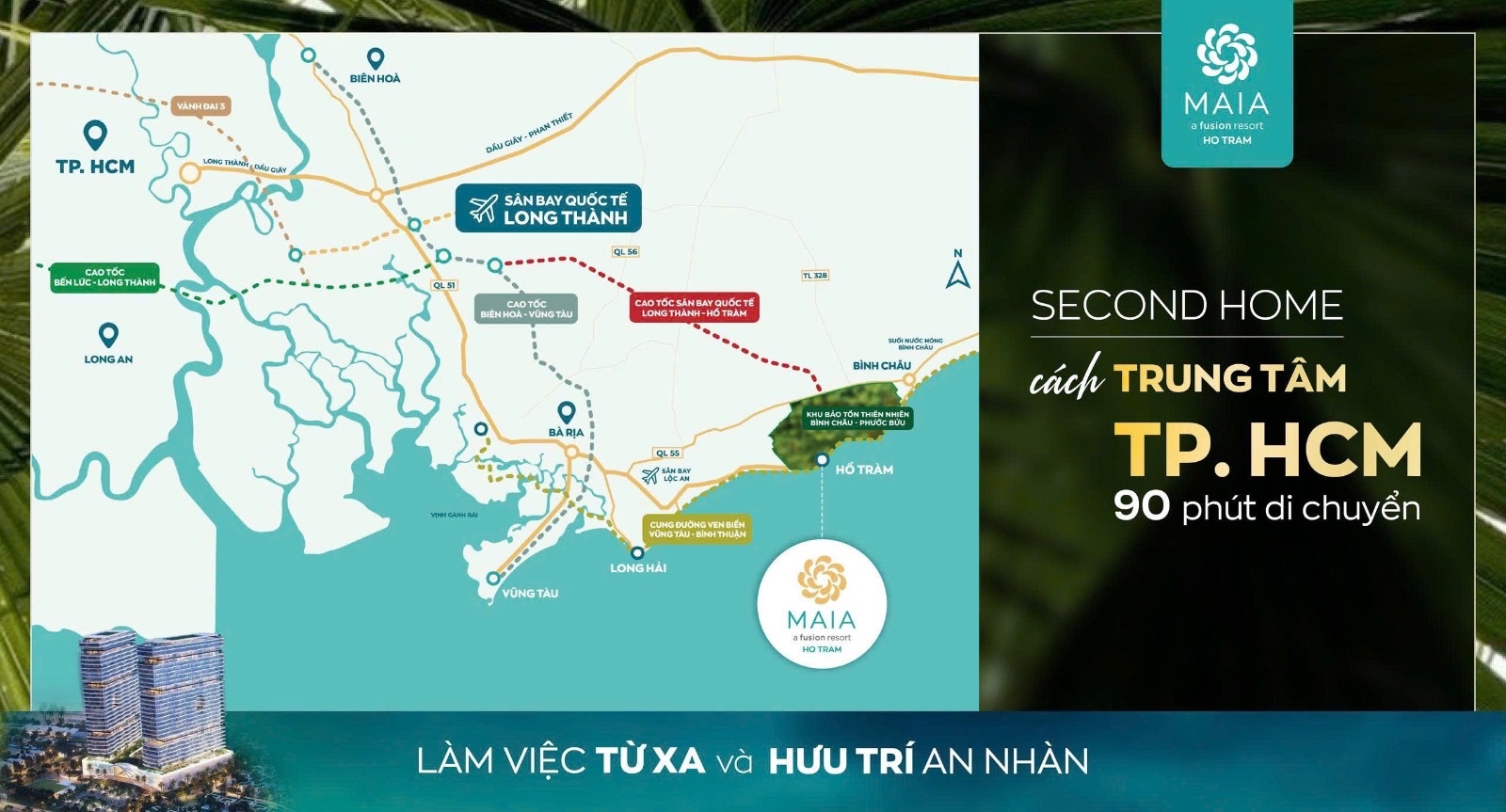Sở hữu vị trí ven biển hiếm hoi gần TP.HCM, Maia Resort Hồ Tràm không chỉ dễ dàng tiếp cận bằng đường bộ, mà còn hưởng lợi từ quy hoạch hạ tầng giao thông liên vùng đang phát triển mạnh mẽ như các tuyến cao tốc và sân bay quốc tế Long Thành.