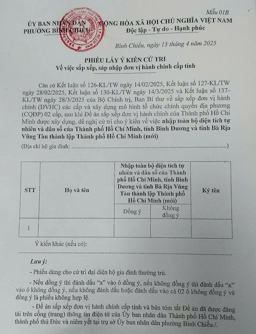 Sáng ngày 13/4, nhiều phường tại TP Thủ Đức đã phát phiếu lấy ý kiến cử tri về việc sắp xếp, sáp nhập các đơn vị hành chính cấp tỉnh. Người dân được đề nghị cho ý kiến “đồng ý” hoặc “không đồng ý” đối với phương án nhập toàn bộ diện tích tự nhiên và dân số của TP HCM, Bình Dương và Bà Rịa – Vũng Tàu để thành lập TP HCM mới. Trường hợp có ý kiến khác, cử tri có thể ghi trực tiếp vào phiếu.